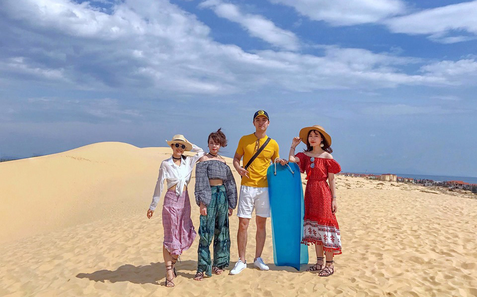 Mình đến lúc 8h tắm nắng luôn và lúc về tầm 10h nóng bỏng chân rồi. Bạn nên đi giày nữa để tránh bị bỏng rát chân và dễ di chuyển hơn. Nói chung lên đây chủ yếu để sống ảo và chơi trượt cát. Giá thuê ván trượt cát là 30.000đ